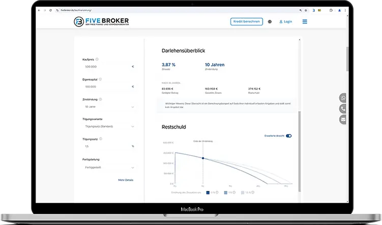 Unser Zinsrechner basiert auf den tagesaktuellen Bankkonditionen und gibt Ihnen eine erste Orientierung. Der endgültige Zinssatz hängt jedoch von individuellen Faktoren wie Bonität, Eigenkapital und Objektbewertung ab.
